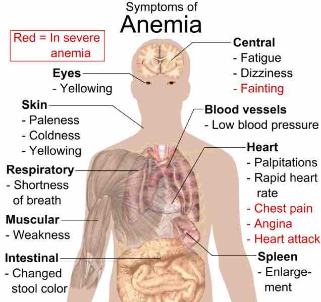 In very severe anemia, the body may compensate for the lack of oxygen-carrying capability of the blood by increasing cardiac output. This would result in symptoms such as palpitations, angina (if preexisting heart disease is present), intermittent claudication of the legs, and symptoms of heart failure .