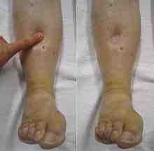 Cutaneous edema is referred to as pitting when, after pressure is applied to a small area, the indentation persists for some time after the release of the pressure. Peripheral pitting edema, as shown in , is the more common type, resulting from water retention. It can be caused by systemic diseases, pregnancy in some women, either directly or as a result of heart failure, or local conditions such as varicose veins, thrombophlebitis, insect bites, and dermatitis. Non-pitting edema is observed when the indentation does not persist. It is associated with such conditions as lymphedema, lipoedema, and myxedema.