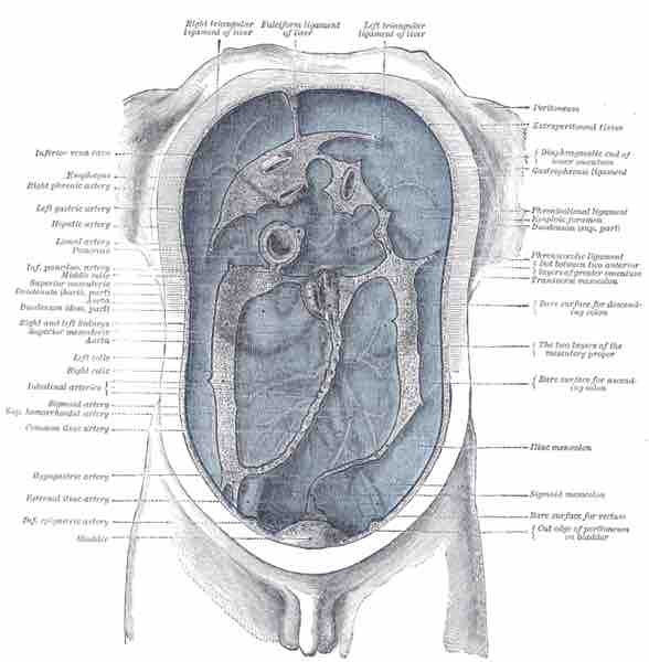 The peritoneum, colored in blue, is the serous membrane that forms the lining of the abdominal cavity. It covers most of the intra-abdominal, supporting them and serving as a conduit for their blood and lymph vessels and nerves. Peritonitis is an inflammation of the peritoneum often causing abdominal pain and tenderness.
