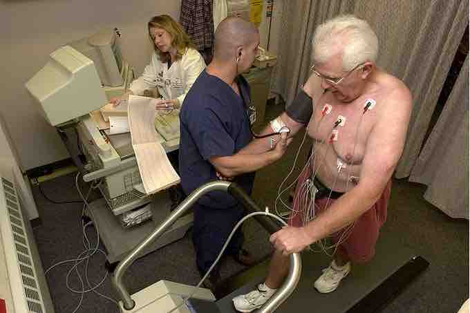 A patient undergoing a stress test. This test examines blood flow to the heart during exertion, and can be used as a diagnostic tool in ischemic heart disease, coronary artery disease, and heart failure.