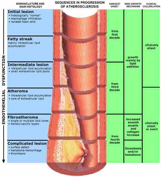 This diagram depicts the progression of atherosclerosis in a blood vessel. In coronary artery disease, these atherosclerotic plaques build up in the coronary arteries and rupture may lead to ischemic heart disease and myocardial infarction.