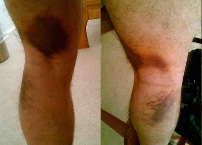 Pulled hamstring after four days. Two images of the same leg. One of the pictures was taken in a mirror.