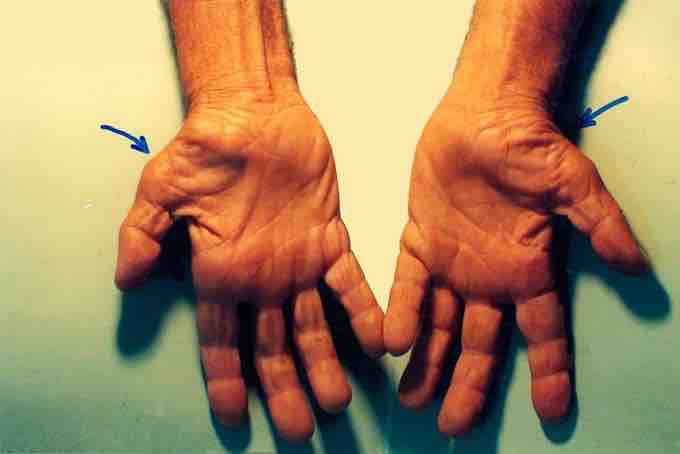 Patients with CTS experience numbness, tingling, or burning sensations in the thumb and fingers, in particular the index, middle fingers, and radial half of the ring fingers, which are innervated by the median nerve. Less-specific symptoms may include pain in the wrists or hands and loss of grip strength. The numbness often occurs at night, with the hypothesis that the wrists are held flexed during sleep. It can be relieved by wearing a wrist splint that prevents flexion. Long-standing CTS leads to permanent nerve damage with constant numbness, atrophy of some of the muscles of the thenar eminence, and weakness of palmar abduction. Pain in carpal tunnel syndrome is primarily numbness that is so intense that it wakes one from sleep. Pain in electrophysiologically verified CTS is associated with misinterpretation of nociception and depression. Palliative treatments for CTS include use of night splints and corticosteroid injection. The only scientifically established disease modifying treatment is surgery to cut the transverse carpal ligament.