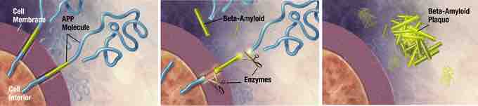 Enzymes act on the APP (Amyloid precursor protein) and cut it into fragments of protein, one of which is called beta-amyloid and its crucial in the formation of senile plaques in AD