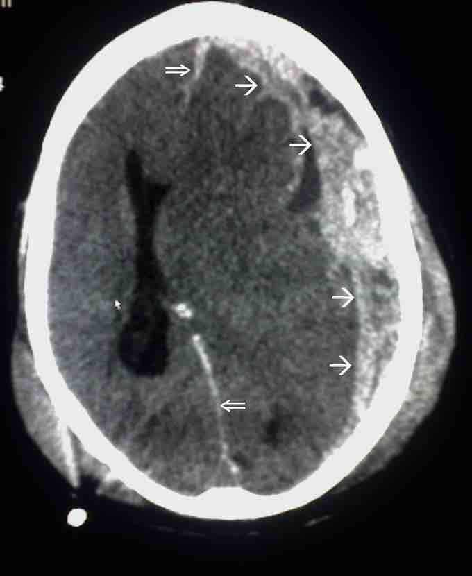 In this image, the single arrow marks spread of the subdural haematoma and the double arrow marks the midline shift.