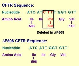 Cystic fibrosis (also known as CF or mucoviscidosis) is an autosomal recessive genetic disorder affecting most critically the lungs and also the pancreas, liver, and intestine. It is characterized by abnormal transport of chloride and sodium across an epithelium, leading to thick, viscous secretions. The name cystic fibrosis refers to the characteristic scarring (fibrosis) and cyst formation within the pancreas. Difficulty breathing is the most serious symptom and results from frequent lung infections that are treated with antibiotics and other medications. Other symptoms, including sinus infections, poor growth, and infertility affect other parts of the body. CF is caused by a mutation in the gene for the protein cystic fibrosis transmembrane conductance regulator (CFTR). The ΔF508 human genome mutation is characterized by the deletion of three base pairs in the CFTR nucleotide sequence, causing the loss of the amino acid phenylalanine located at position 508 . This protein is required to regulate the components of sweat, digestive juices, and mucus. CFTR regulates the movement of chloride and sodium ions across epithelial membranes, such as the alveolar epithelia located in the lungs. Although most people without CF have two working copies of the CFTR gene, only one is needed to prevent cystic fibrosis due to the disorder's recessive nature. CF develops when neither gene works normally (as a result of mutation) and therefore has autosomal recessive inheritance.