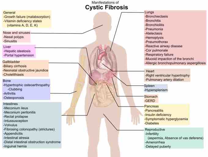 A diagram showing clinical manifestations of cystic fibrosis.