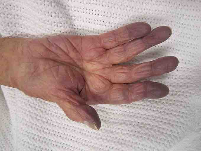 Cyanosis in the hand of patient suffering from hypoxia.