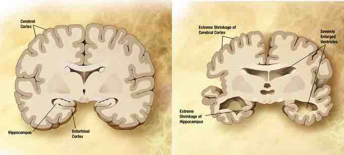Comparison of a normal aged brain (left) and the brain of a person with Alzheimer's (right). Differential characteristics are pointed out.