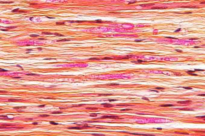 Micrograph of a nerve with a decrease in myelinated nerve fibres (pink) and an abnormal increase in fibrous tissue (yellow), as may be seen in nerve injuries.