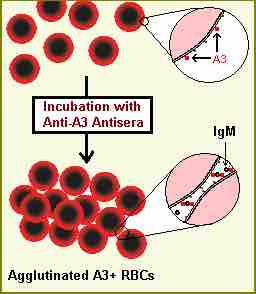 Red blood cells can agglutinate if the serum contains antibodies against the expressed proteins. In this image, the blood serum contains anti-A3 antibodies, which attack and agglutinate type A blood.