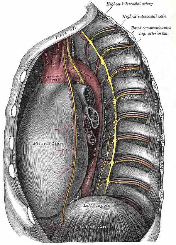 As it descends in the thorax, the aorta gives off several paired branches. In descending order these are the bronchial arteries, the mediastinal arteries, the esophageal arteries, the pericardial arteries, and the superior phrenic artery. The posterior intercostal arteries are branches that originate throughout the length of the posterior aspect of the thoracic aorta.