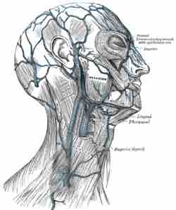 The veins of head and neck are labeled in blue, with an arrow pointing to the auricular vein.