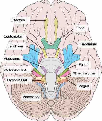 Cranial nerves are nerves that emerge directly from the brain, in contrast to spinal nerves, which emerge from segments of the spinal cord. In humans, there are traditionally twelve pairs of cranial nerves. Only the first and the second pair emerge from the cerebrum; the remaining ten pairs emerge from the brainstem.