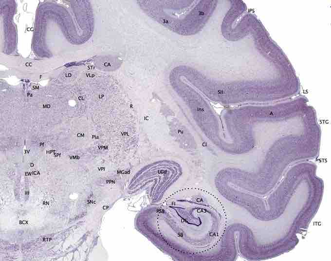 The cerebral cortex is the outer layer depicted in dark violet. Notice the folded structure of the cortex: the "valleys" of the cortex are known as sulci.