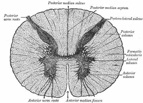 The spinal cord is compressed dorsoventrally, giving it an elliptical shape . The cord has grooves in the dorsal and ventral sides. The posterior median sulcus is the groove in the dorsal side, and the anterior median fissure is the groove in the ventral side.