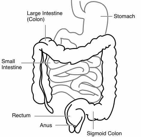 Image shows the relationship of the colon to the other parts of the digestive system.