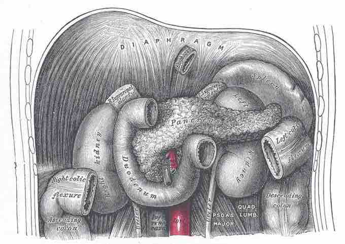 The pancreas is located posterior to the stomach and next to the duodenum. The pancreas functions as both an exocrine and endocrine. The exocrine function of the pancreas is essential for digestion as the produces many of the enzymes that break down protein, carbohydrates, and fats in digestible foods.