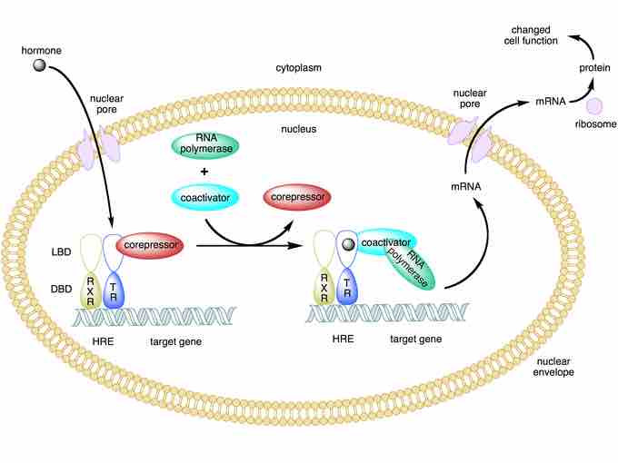 The thyroid hormone receptor (TR) heterodimerized to the RXR. In the absence of a ligand, the TR is bound to a corepressor protein. Ligand binding to the TR causes a dissociation of co-repressor and recruitment of co-activator proteins, which in turn recruit additional proteins (such as RNA polymerase) that are responsible for the transcription of downstream DNA into RNA, and eventually into protein that results in a change in cell function.
