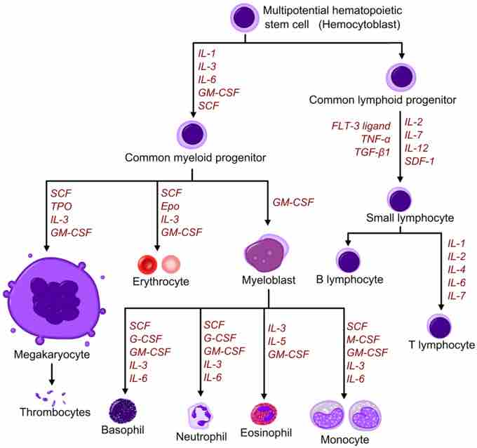 This chart shows the complexity of interactions, and the multitude of growth factors that stimulate proliferation and differentiation of cells that is common to all cell types. The majority of growth factors shown above are cytokines such as GM-CSF, however the hormone EPO secreted by the kidney plays a key role in erythrocyte (red blood cell) proliferation.