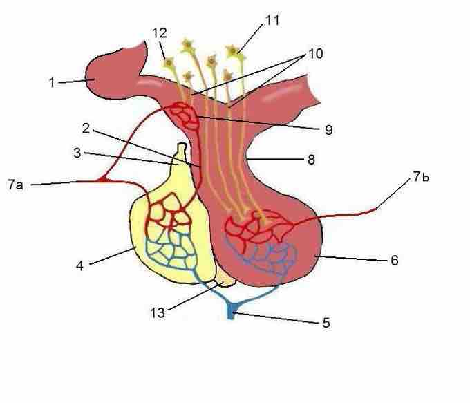 The fleshy, glandular anterior pituitary is distinct from the neural composition of the posterior pituitary. The anterior pituitary is composed of multiple parts: