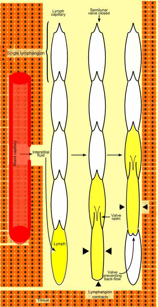 One of the main structural features of lymph vessels is their valves, which are semilunar structures attached to opposite sides of the lymphatic endothelium. Valves are found in larger lymph vessels and collecting vessels and are absent in the lymphatic capillaries. The valves is to prevent backflow of fluid, so that lymph eventually flows forward instead of falling backwards. When the pressure of lymph fluid increase to a certain point due to filling with more lymph fluid or from smooth muscle contraction, the fluid will be pushed through the valve (opening it) into the next chamber of the vessel (called a lymphangion). As the pressure falls, the open valve then closes so that the lymph fluid cannot flow backwards.