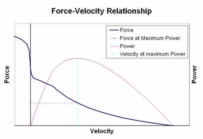 As velocity increases force and therefore power produced is reduced. Although force increases due to stretching with no velocity, zero power is produced. Maximum power is generated at one-third of maximum shortening velocity.