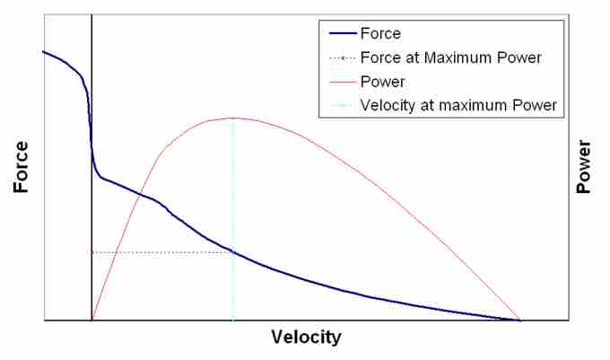As velocity increases force and power produced is reduced. Although force increases due to stretching with no velocity, zero power is produced. Maximum power is generated at one-third of maximum shortening velocity.