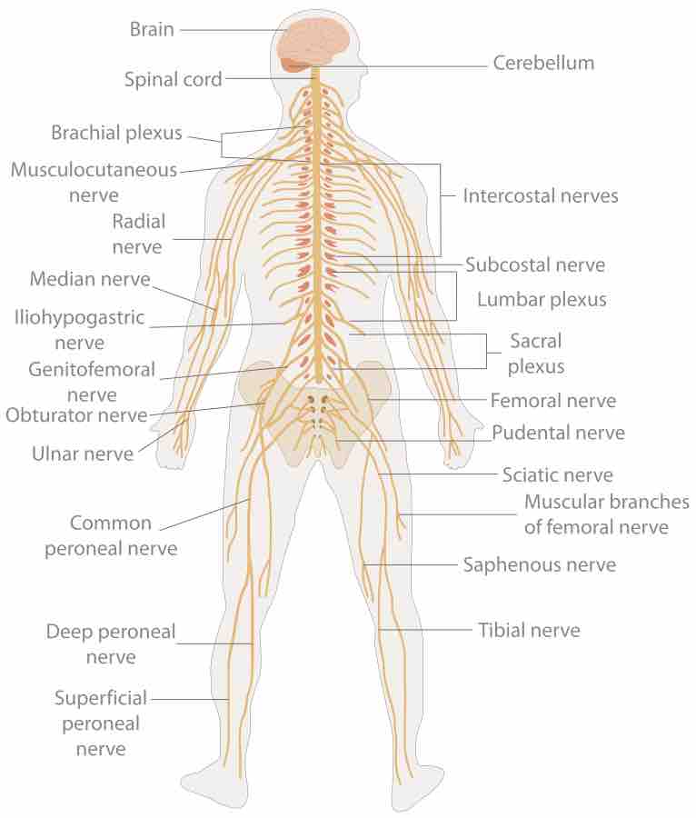 This diagram details the parts of the central nervous system, including brain, spinal cord, brachial plexus, musculocutaneous nerve, radial nerve, median nerve, iliohypogastric nerve, genitofemoral nerve, obturator nerve, ulnar nerve, common peroneal nerve, deep peroneal nerve, superficial peroneal nerve, tibial nerve, saphenous nerve, muscular branches of femoral nerve, sciatic nerve, pudendal nerve, femoral nerve, sacral plexus, lumbar plexus, subcostal nerve, intercostal nerve, cerebellum.