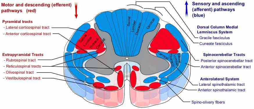 This diagram of spinal cord tracts shows the motor and efferent pathways in red and the sensory and afferent pathways in blue. Included in the diagram are the following motor pathways: corticospinal tracts (pyramidal tract), and extrapyramidal tracts (tectospinal tract not delineated).