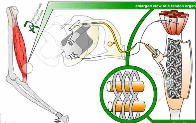 The Golgi tendon organ, responsible for the Golgi tendon reflex, is diagrammed with its typical position in a muscle (left), neuronal connections in spinal cord (middle), and expanded schematic (right). The tendon organ is a stretch receptor that signals the amount of force on the muscle and protects the muscle from excessively heavy loads by causing the muscle to relax and drop the load.
