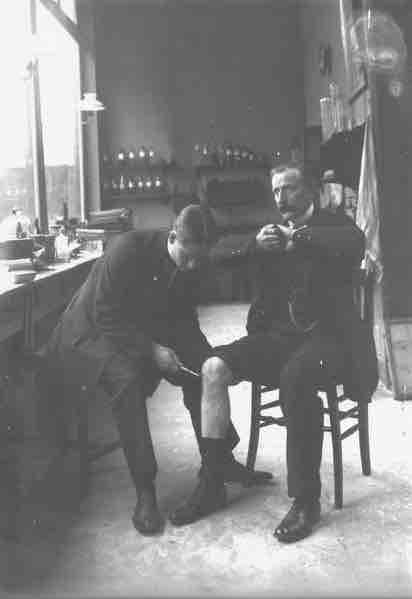 The Jendrassik maneuver is a medical maneuver wherein the patient flexes both sets of fingers into a hook-like form and interlocks those sets of fingers together (note the hands of the patient in the chair). This maneuver is used often when testing the patellar reflex, as it forces the patient to concentrate on the interlocking of the fingers and prevents conscious inhibition or influence of the reflex.