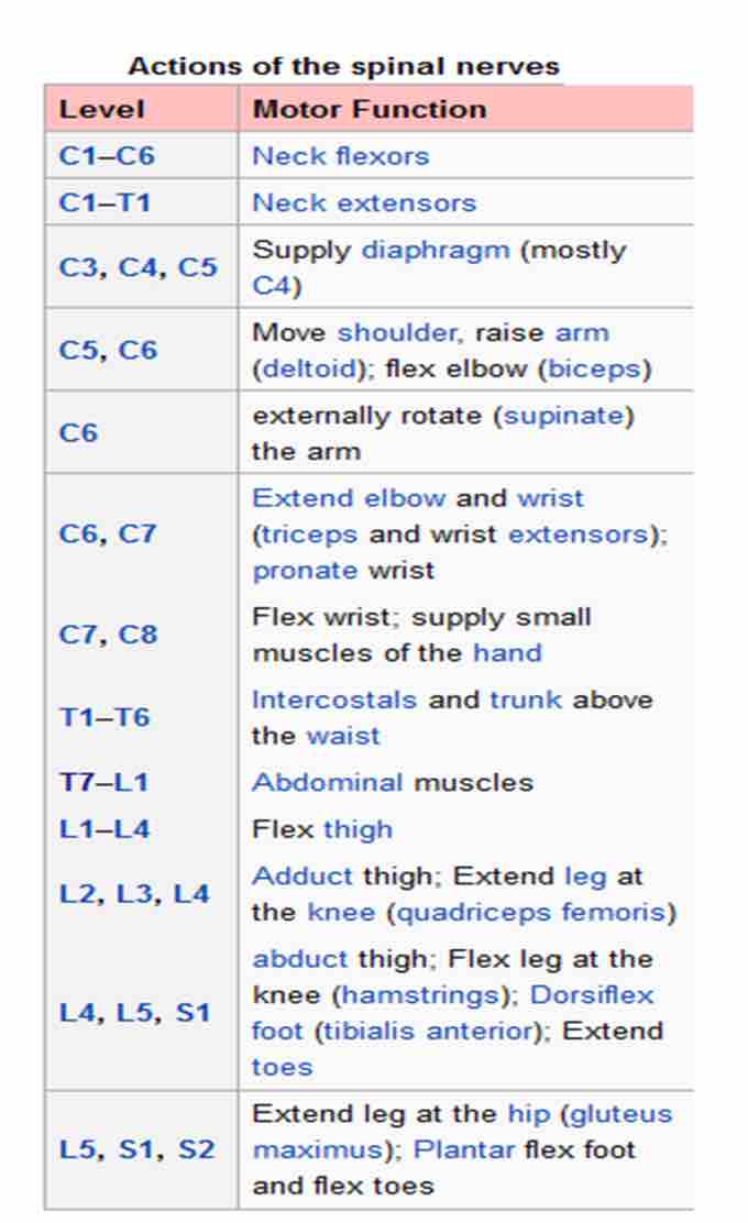 Spinal nerve motor functions are summarized in the table below.