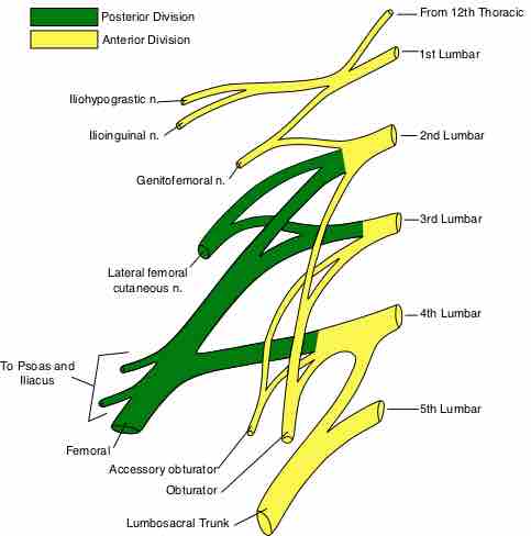 The lumbar plexus is comprised of the ventral rami of the lumbar spinal nerves (L1–L5) and a contribution from thoracic nerve (T12). The posterior (green) and anterior (yellow) divisions of the lumbar plexus are shown in the diagram.