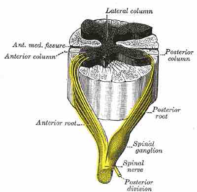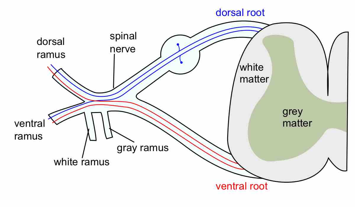 Sensory nerves of a dorsal root ganglion are depicted entering the spinal cord.
