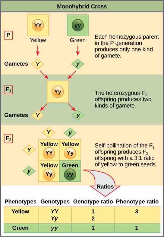 To demonstrate a monohybrid cross, consider the case of true-breeding pea plants with yellow versus green pea seeds. The dominant seed color is yellow; therefore, the parental genotypes were YY (homozygous dominant) for the plants with yellow seeds and yy (homozygous recessive) for the plants with green seeds, respectively. A Punnett square, devised by the British geneticist Reginald Punnett, can be drawn that applies the rules of probability to predict the possible outcomes of a genetic cross or mating and their expected frequencies.To prepare a Punnett square, all possible combinations of the parental alleles are listed along the top (for one parent) and side (for the other parent) of a grid, representing their meiotic segregation into haploid gametes . Then the combinations of egg and sperm are made in the boxes in the table to show which alleles are combining. Each box then represents the diploid genotype of a zygote, or fertilized egg, that could result from this mating. Because each possibility is equally likely, genotypic ratios can be determined from a Punnett square. If the pattern of inheritance (dominant or recessive) is known, the phenotypic ratios can be inferred as well. For a monohybrid cross of two true-breeding parents, each parent contributes one type of allele. In this case, only one genotype is possible. All offspring are Yy and have yellow seeds.