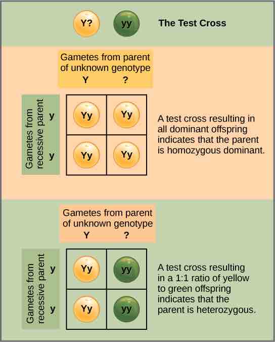 Beyond predicting the offspring of a cross between known homozygous or heterozygous parents, Mendel also developed a way to determine whether an organism that expressed a dominant trait was a heterozygote or a homozygote. Called the test cross , this technique is still used by plant and animal breeders. In a test cross, the dominant-expressing organism is crossed with an organism that is homozygous recessive for the same characteristic. If the dominant-expressing organism is a homozygote, then all F1 offspring will be heterozygotes expressing the dominant trait. Alternatively, if the dominant expressing organism is a heterozygote, the F1 offspring will exhibit a 1:1 ratio of heterozygotes and recessive homozygotes. The test cross further validates Mendel's postulate that pairs of unit factors segregate equally.
