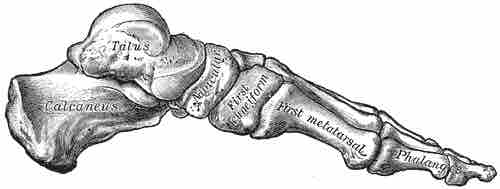 Its summit is at the superior articular surface of the talus. Its two extremities or piers, on which it rests in standing, are the tuberosity on the plantar surface of the calcaneus posteriorly, and the heads of the first, second, and third metatarsal bones anteriorly.