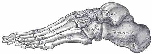 In contrast, the lateral longitudinal arch is very low. It is composed of the calcaneus, the cuboid, and the fourth and fifth metatarsals.