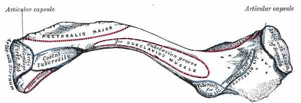 The left clavicle, viewed from above. Muscle attachment sites (pectoralis major, subclavius muscle, deltoid, and sterno-hyoid) are highlighted.