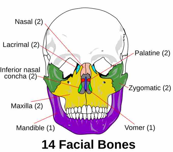 The face is made of 2 nasal, 2 lacrimal, 2 palantine, 2 inferior nasal concha, 2 zygomatic, 2 maxilla, 1 mandible, and 1 vomer.