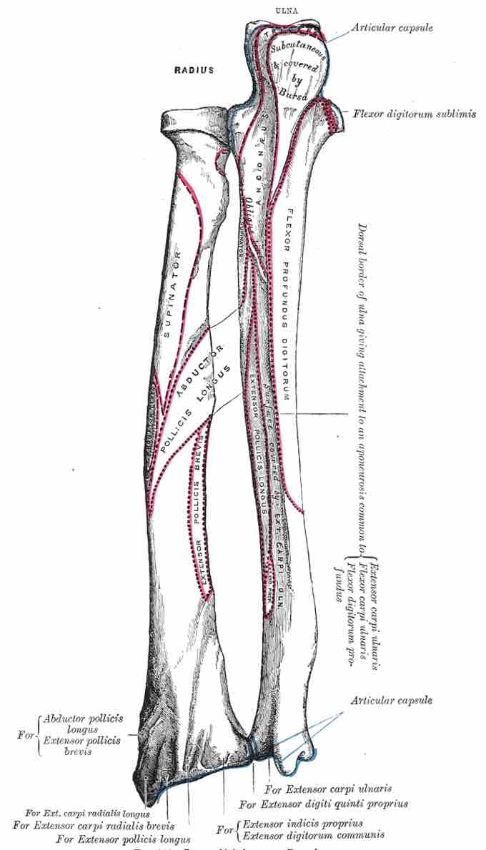 The forearm contains two bones—the radius and the ulna—that extend in parallel from the elbow, where they articulate with the humerus to the wrist, where they articulate with the carpals. The space between the two bones is spanned by the interosseous membrane.
