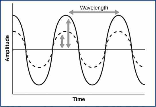 For sound waves, wavelength corresponds to pitch. The amplitude of the wave corresponds to volume. The sound wave shown with a dashed line is softer in volume than the sound wave shown with a solid line.
