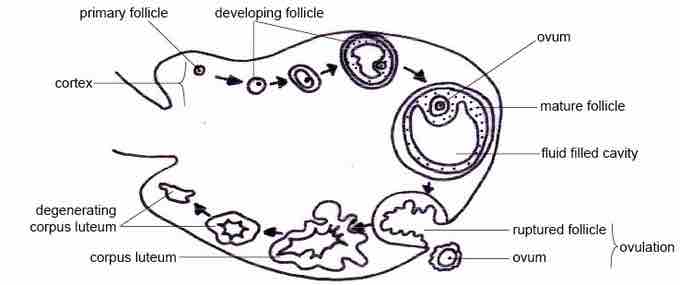 Ovulation is the phase in which a mature ovarian follicle ruptures and discharges an ovum (also known as an oocyte, female gamete, or egg). Ovulation also occurs in the estrous cycle of other female mammals, which differs in many fundamental ways from the menstrual cycle. The time immediately surrounding ovulation is referred to as the ovulatory phase or the periovulatory period.