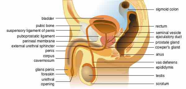 The penis is the male organ for sexual intercourse and urination. Semen and urine leave the penis through the urethra. The scrotum is a loose, pouch-like sack of skin that hangs behind the penis, containing the testes.