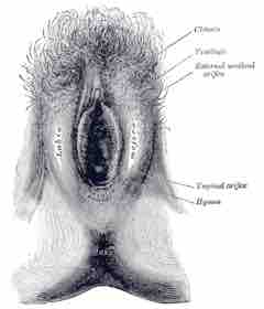 Location of the external urethral orifice in adult females. between the vestibule and the vaginal orifice.