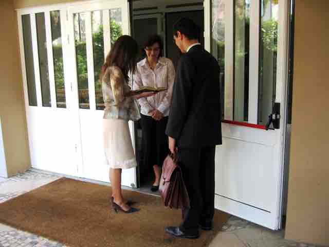 The specific beliefs and practices (such as a belief in door-to-door proselytizing, depicted here) of the Jehovah's Witnesses has meant that Jehovah's Witnesses' litigation has played a key role in defining the Free Exercise Clause of the First Amendment.