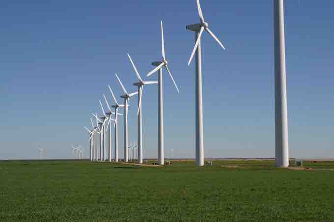 The Brazos Wind Farm, also known as the Green Mountain Energy Wind Farm, near Fluvanna, Texas. Note cattle grazing beneath the turbines.