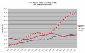General government debt as a percent of GDP in USA, Japan, and Germany.