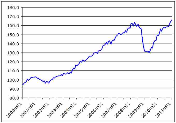 Evolution of international trade since 2000. There exists a dip in 2009 that corresponds to the recession of 2008.
